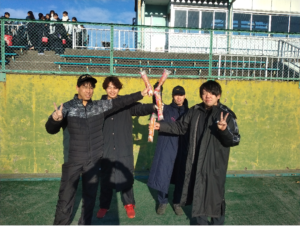 ナイススティックを掲げている4名はナイススティッカーズというソフトテニス